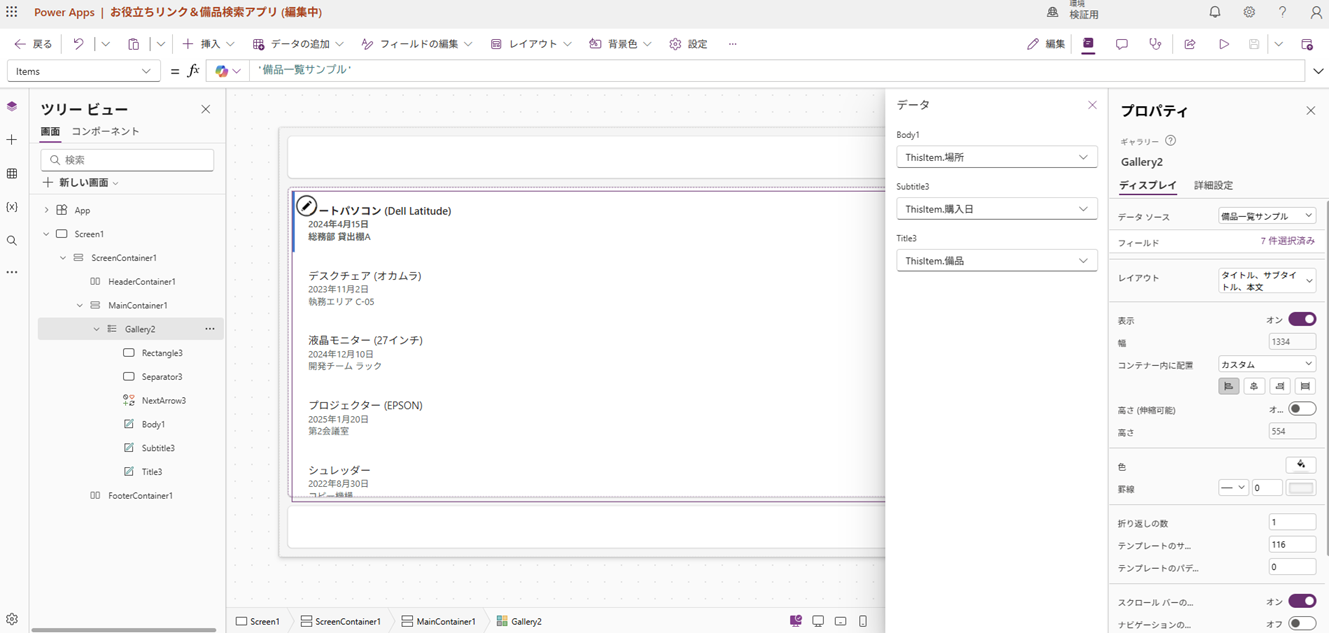 Tips: ギャラリーのデータを選択時、備品~場所は、それぞれfield_#(SharePointリストの項目列の順番)が該当します。