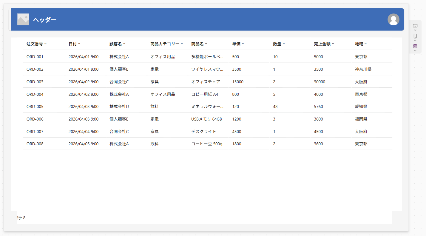 テンプレート「ヘッダーとテーブル」が一覧表示用なのに対し、このテンプレートはテーブルデータを編集可能です。