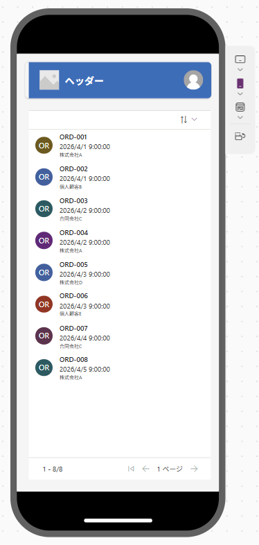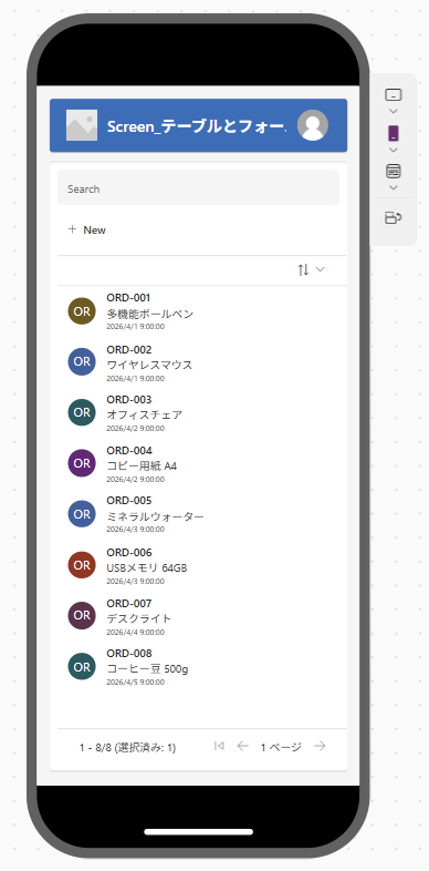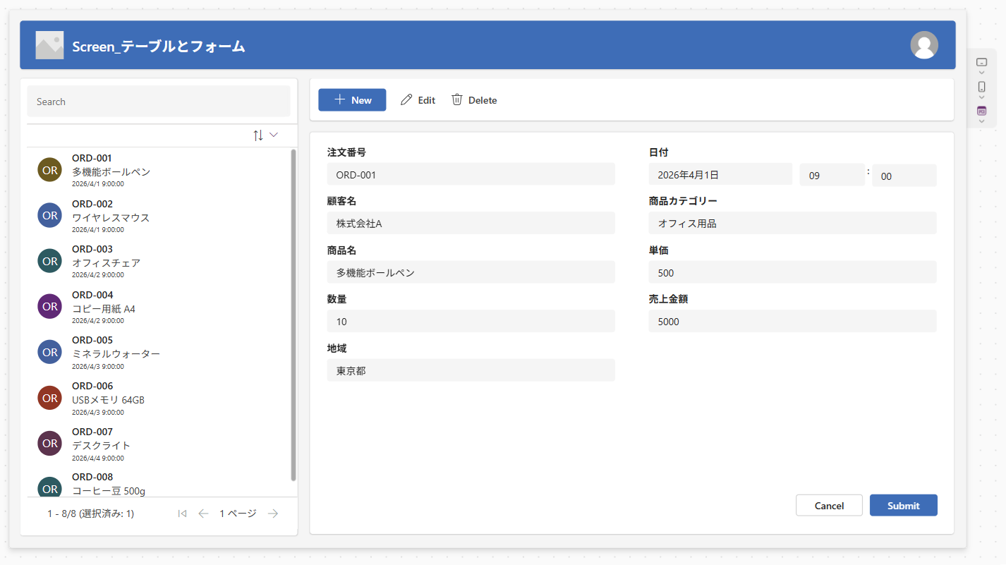 データソースをテーブルにすると、メインコンテナは選択用のサイドメニューと編集用のフォームエリアに変わります。