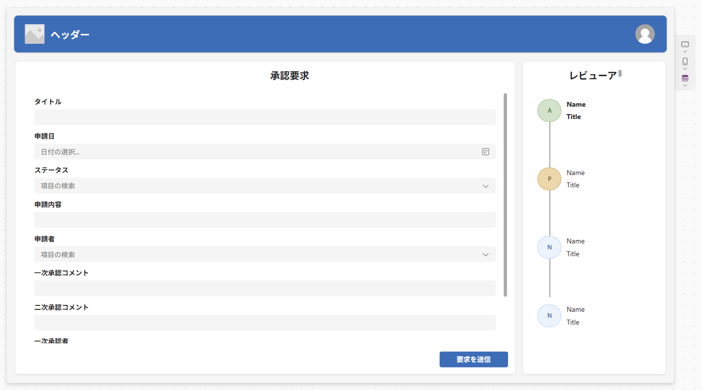 このテンプレートの作りは、ヘッダーの下に、承認要求の入力エリアとレビューアのエリアがあります。