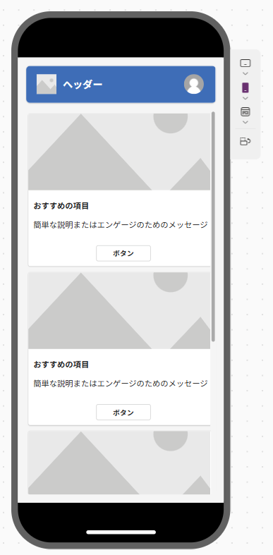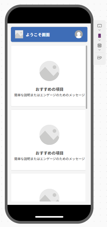 テンプレート「ようこそ画面」は一つ一つのカードに画像やテキストを設定できるのに対し、テンプレート「ヘッダーとギャラリー」はデータソースのデータをそのまま使って一覧にします。